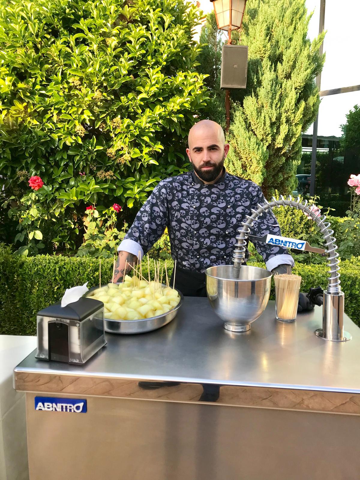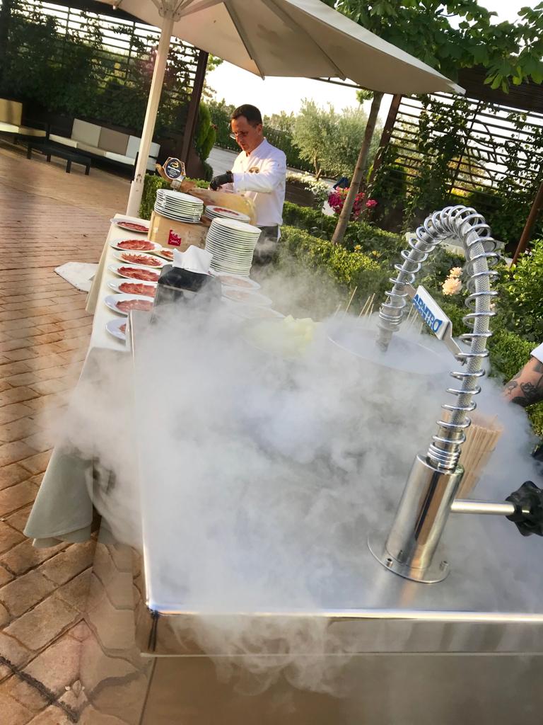 Pero no sólo de amor y color vive el hombre ?. Antonio y Aurora quisieron que sus invitados disfrutasen desde su llegada, así que nada mejor que recibirles con estas mesas especiales, incluyendo el rincón destinado a los aperitivos «nitro» de Dani que, una vez más, no dejó indiferente a ningún invitado.