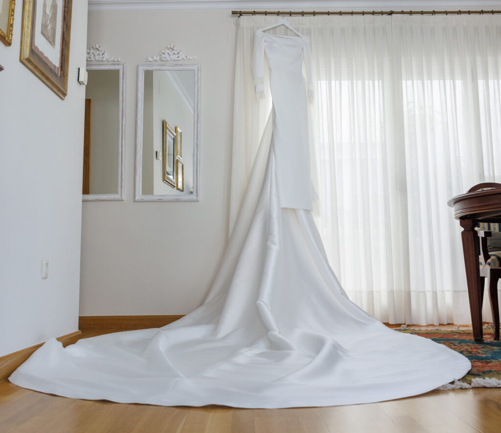 El proceso fue cercano y muy cuidado: bocetos, pruebas, feedback constante… hasta dar forma a un vestido completamente a medida. Un diseño elegante y con presencia, con escote barco y una cola espectacular de cinco metros.