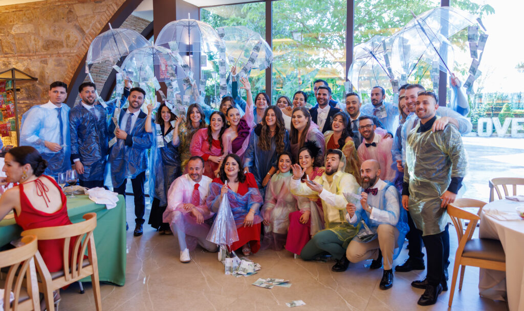 Tras acabar de comer, las sorpresas no se hicieron esperar… Las amigas de Ana prepararon una performance con chubasqueros y paraguas llenos de billetes de mentira, recordando que tanto la pedida como la despedida estuvieron marcadas por la lluvia.