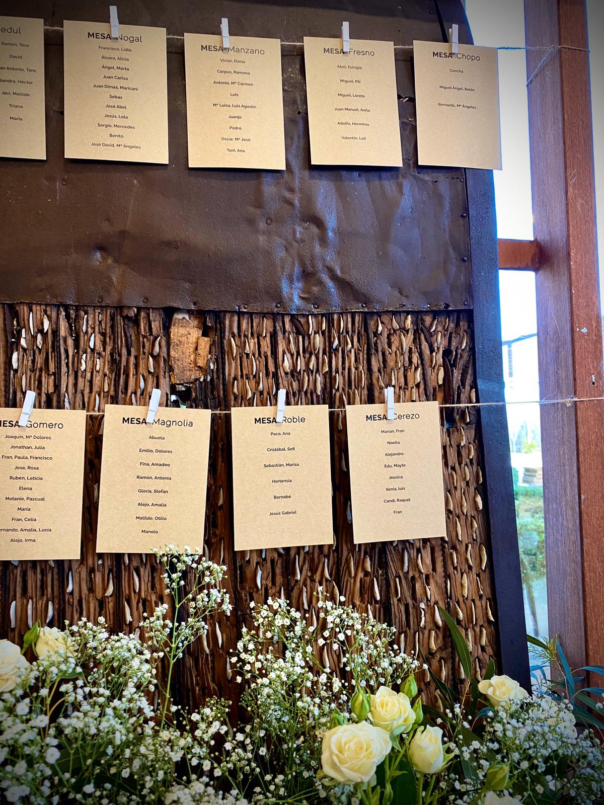 La verdad es que el evento fue magnífico y lleno de detalles para los novios-papis y el pequeño. Agustín, Sarai y el peque eran la felicidad personificada… y a ella nos unimos todos. Vamos a compartir con vosotros algunos de los detalles de la decoración de la boda, como este Seating Plan que quedó de los más «natural». Cada mesa relacionada con un tipo de árbol y con las flores y la madera como protagonista.