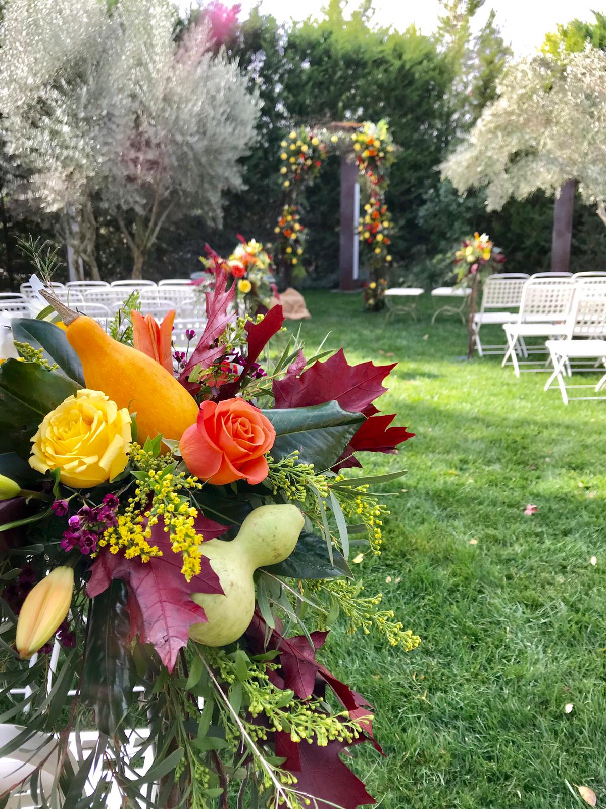 Lógicamente, las calabazas compartieron protagonismo con Juan Antonio y Violeta en la zona destinada a la ceremonia. Ya fuese en el altar o en los adornos florales de las sillas de los invitados, las calabazas estaban por todos lados.