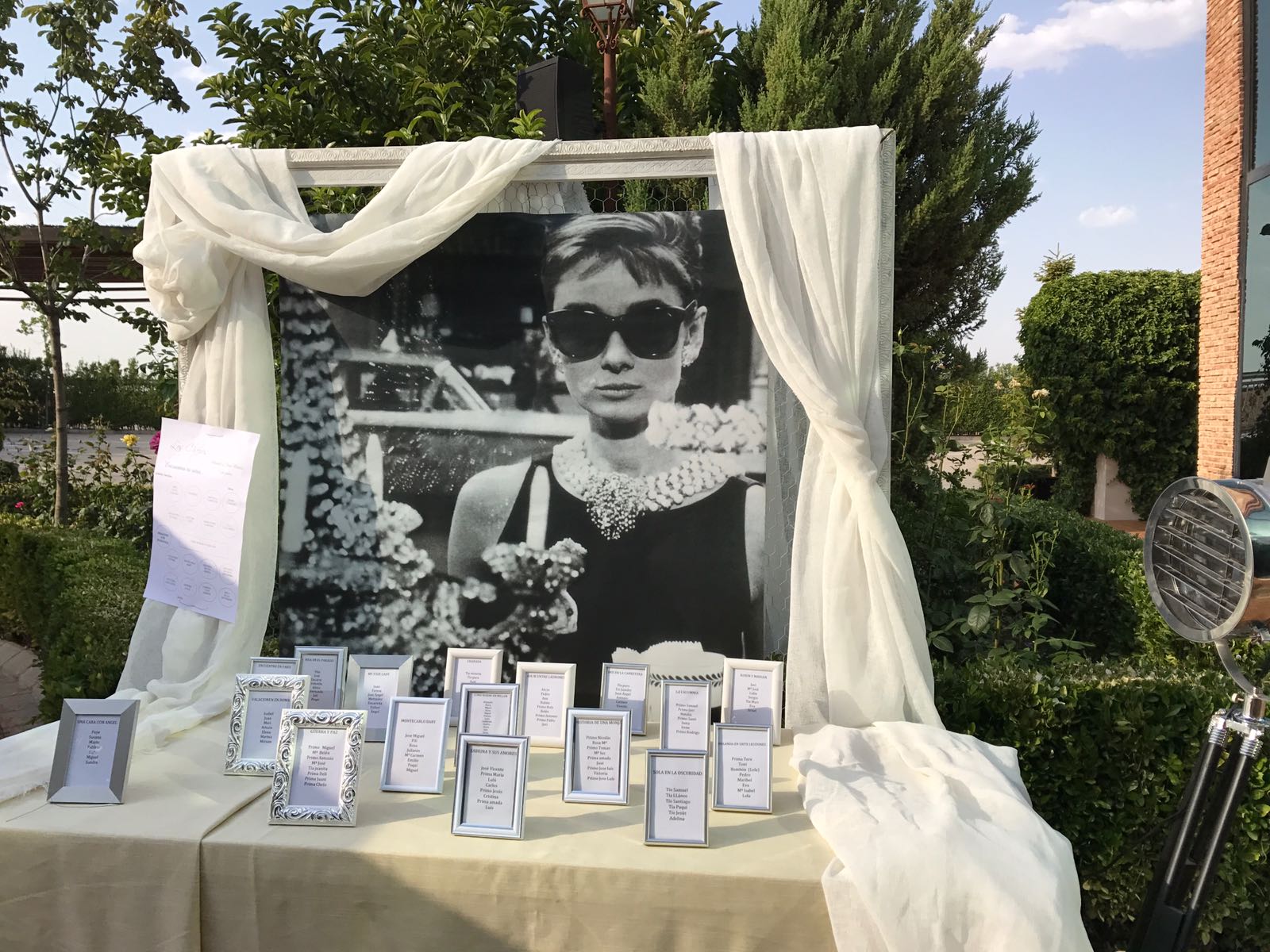 Adoras a Audrey Hepburn. Te vuelves loco con sus películas. ¿Por qué no decírselo a tus invitados? Esto hicieron nuestros amigos. Una gran foto de la genial actriz y algunos de los títulos de sus películas para el nombre de las mesas. Un gran acierto que deja ver la personalidad y gusto de los novios. De diez.