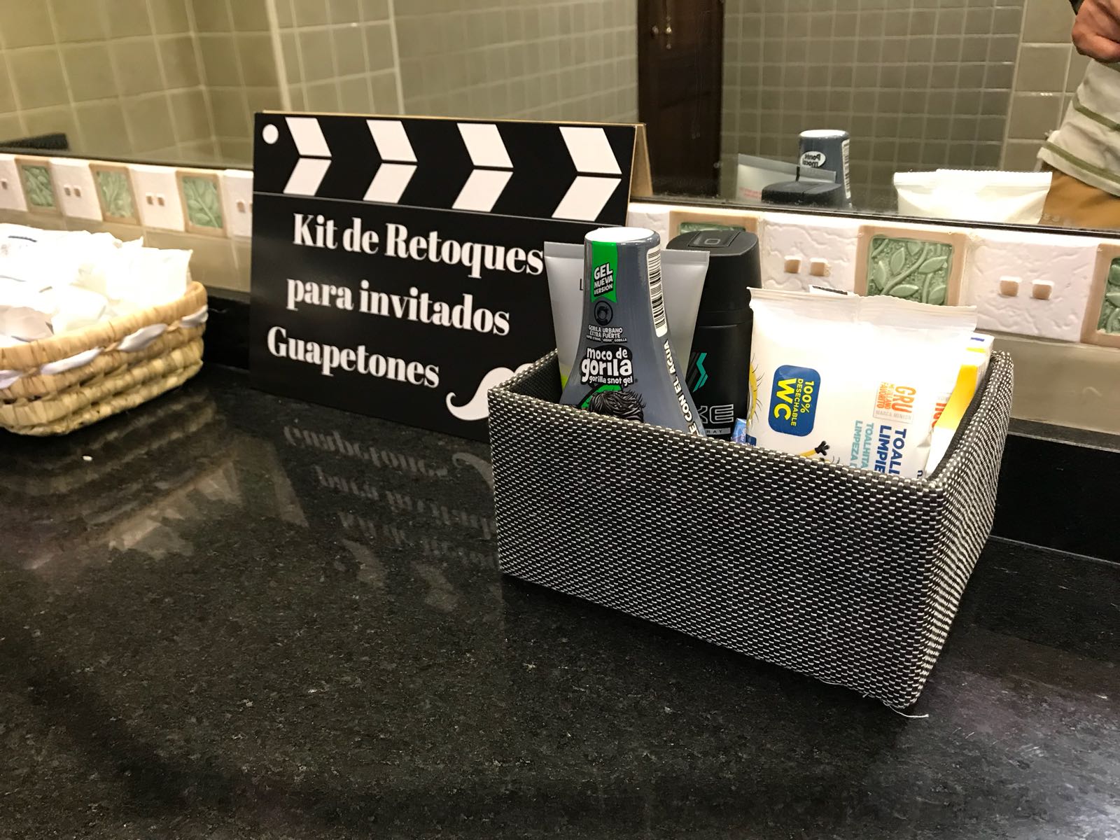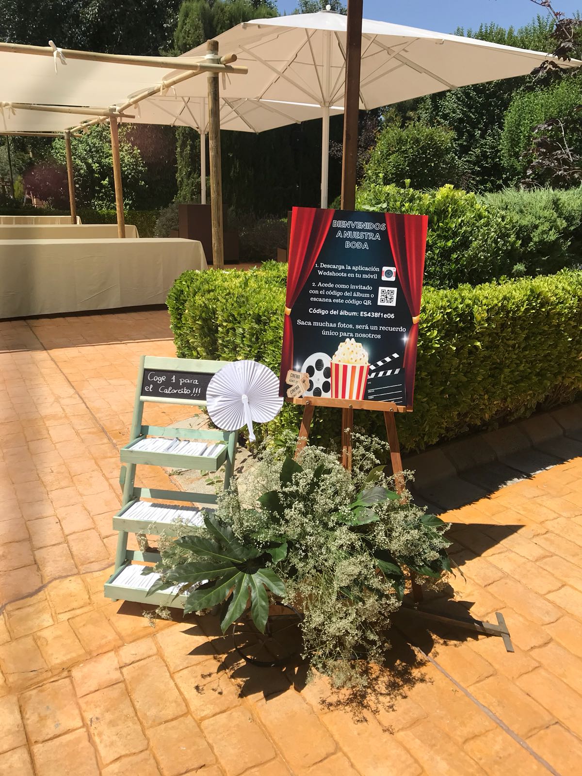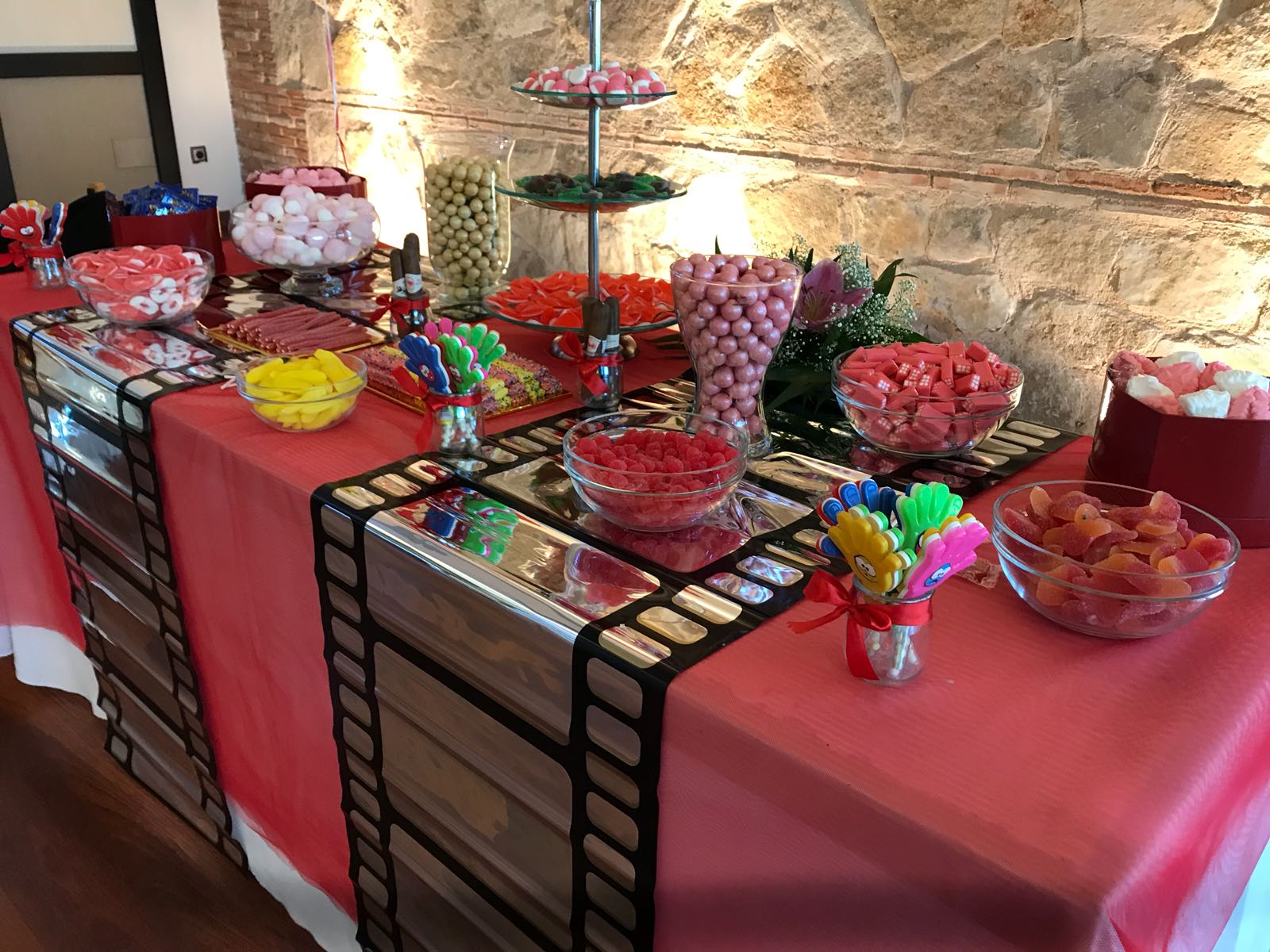 Pero Jose y Cristi no quisieron que se quedara ahí la decoración de su gran día. El photocall era como la sala de vestuarios de la película… y el Buffet de Chuches un pequeño catering para que todos los actores pudieran picotear algo entre escena y escena.