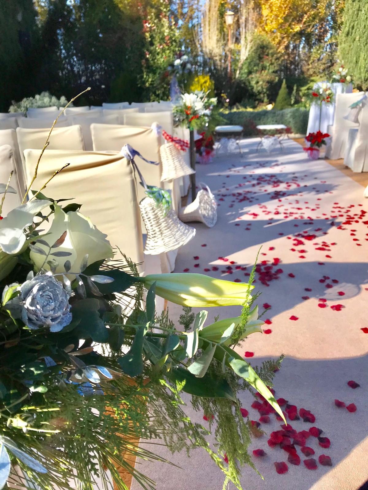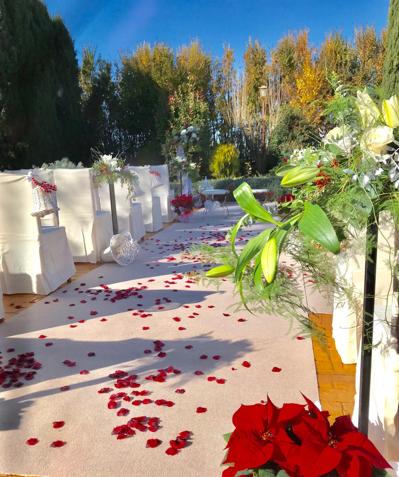 Una boda muy navideña tiene que comenzar a notarse nada más entrar a los Jardines. Y así fue en este caso, pues el rojo navideño envolvía a los invitados desde su llegada.
