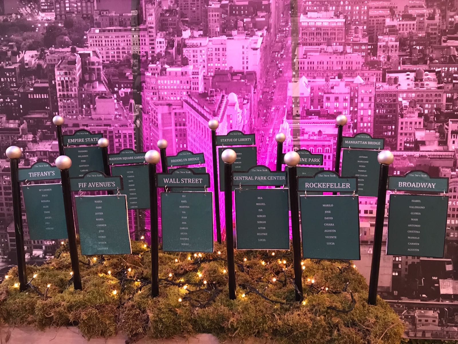 Una vez terminada la ceremonia, tocaba visitar el precioso Seating Plan neoyorkino para saber cuál era la mesa en la que nos debíamos sentar para disfrutar del banquete. La verdad es que tanto de día como de noche, el Seating Plan quedó muy vistoso.